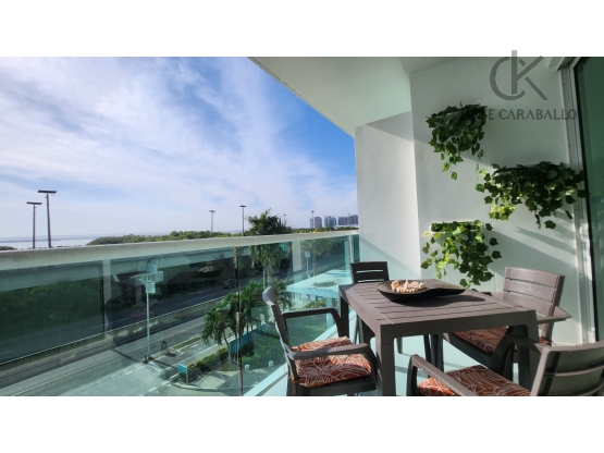 Área total de 60 m² con balcón y vista abierta a la ciénaga.